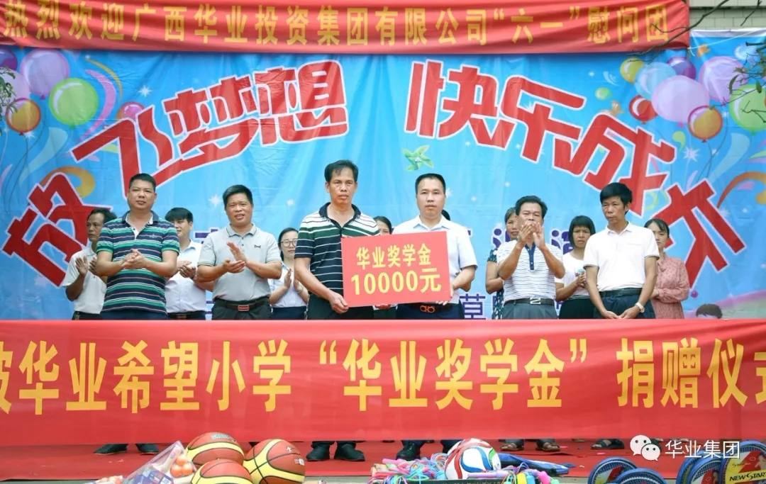2019年5月30日,蓆草陂華業(yè)希望小學(xué)“華業(yè)獎教學(xué)金”捐贈儀式隆重舉行,華業(yè)集團總裁龍其偉、工會主席鐘麗霞等華業(yè)集團員工參加了捐贈儀式,并給希望小學(xué)贈送了學(xué)習(xí)用品、體育用品等物資。高橋鎮(zhèn)鎮(zhèn)長舒金、華業(yè)希望..