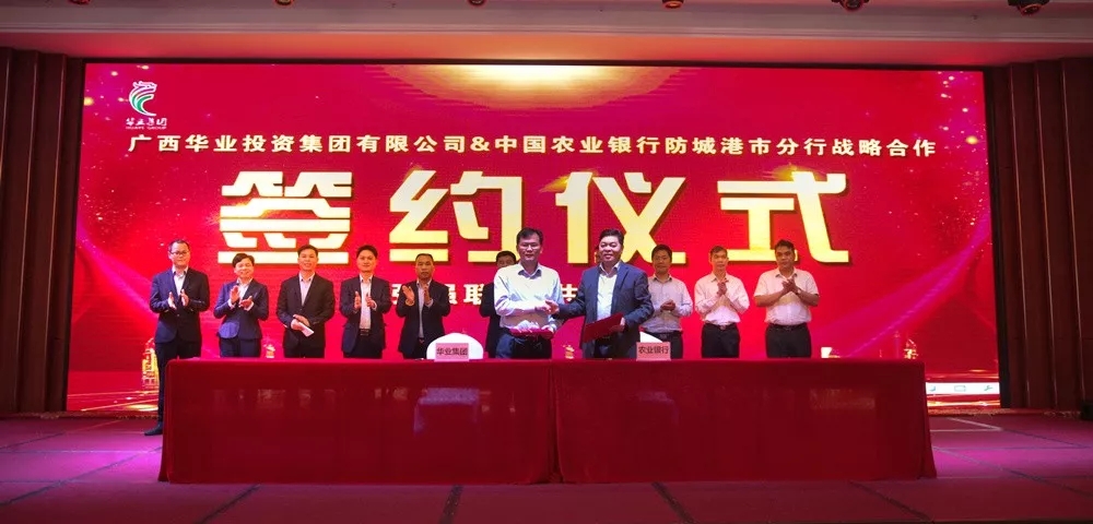 2018年3月28日,廣西華業(yè)投資集團有限公司與中國農(nóng)業(yè)銀行防城港分行在廣西防城港華業(yè)城舉行戰(zhàn)略合作簽約儀式。華業(yè)集團董事長龍其生、龍其偉總裁、副總裁廖人興、副總裁龐樹玉、副總裁熊昭斐、財務(wù)總監(jiān)李情,中國農(nóng)業(yè)銀行防城港分行行長顏雄、副行長陳增熙、公司部總經(jīng)理唐健文、農(nóng)業(yè)銀行防城支行行長劉威、副行長易成等領(lǐng)導(dǎo)和嘉賓出席了簽約儀式。廣西華業(yè)集團副總裁廖人興和中國農(nóng)業(yè)銀行防城港分行副行長陳增熙代表雙方簽署了授信60億元人民幣的戰(zhàn)略合作協(xié)議。
