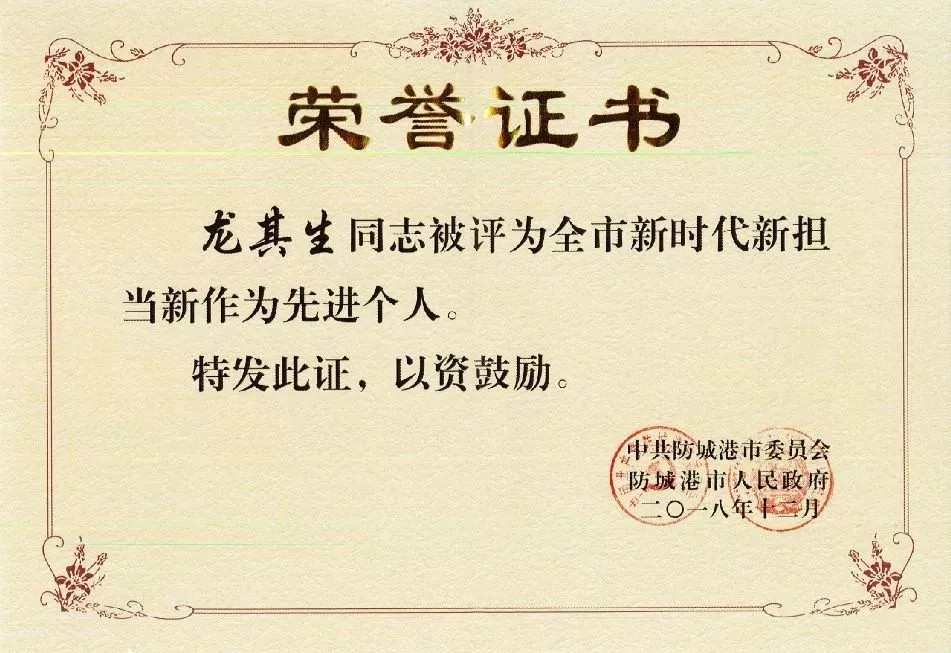 龍其生董事長榮獲防城港市“新時代新?lián)?dāng)新作為先進(jìn)個人”榮譽(yù)稱號